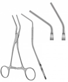 Зажим сосудистый Дебейки с атравматической насечкой Дебейки изогнутый под углом с длиной рабочей части 30 мм и дл. 160 мм.